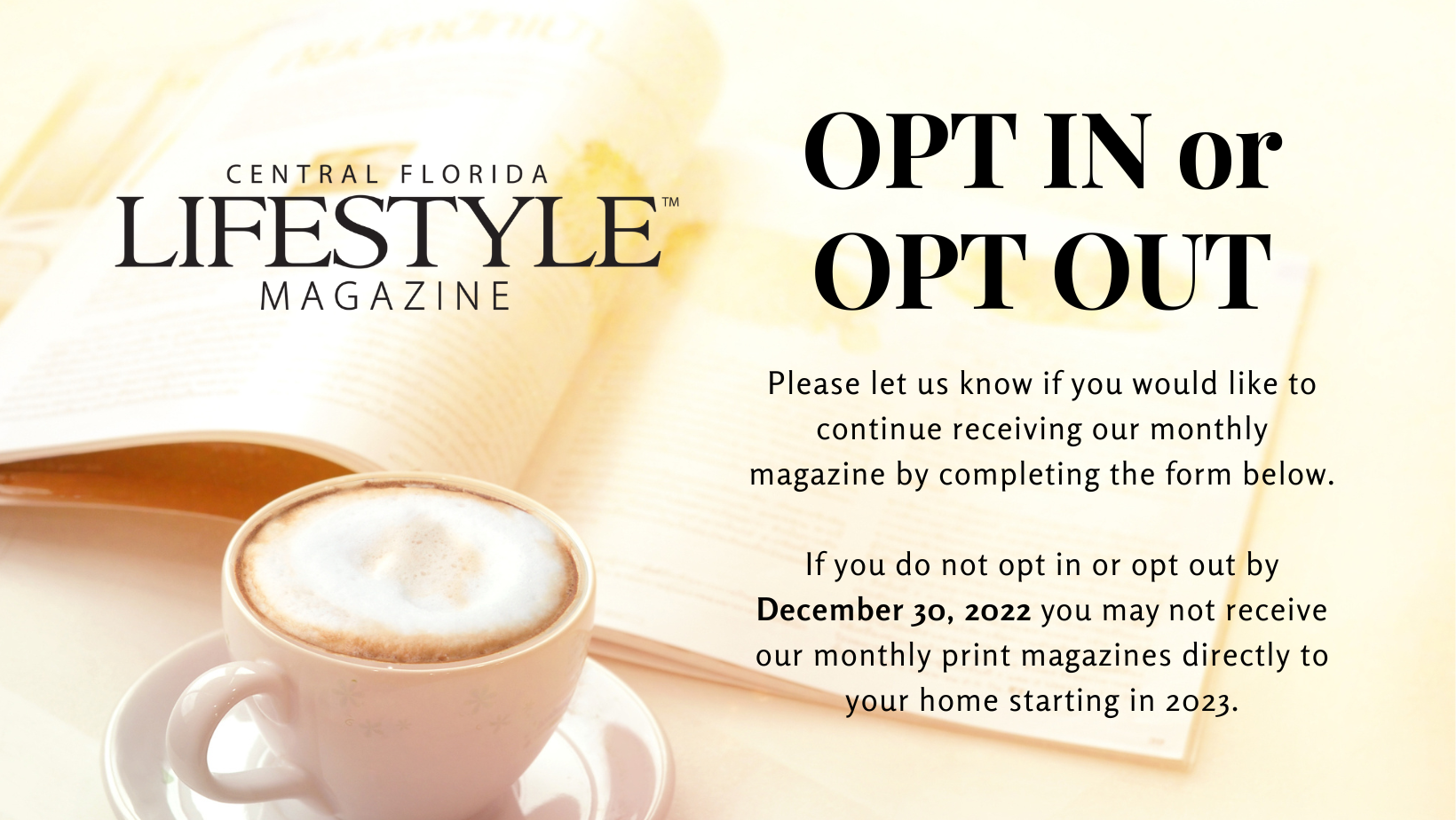 If you do not opt in or opt out by December 30, 2022 you may not receive our monthly print magazines directly to your home starting in 2023. We only mail to Central Florida addresses.